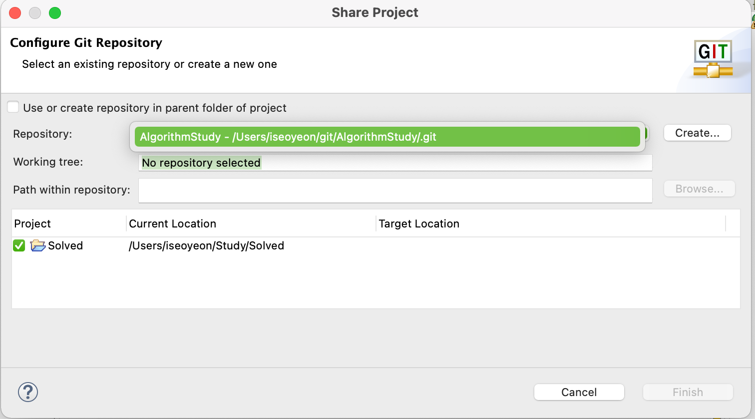 맨위의 Directory는 컴퓨터에서 저장할 경로이다. 보통은 git 폴더 안으로 들어간다. 그리고 Finish 를 선택.