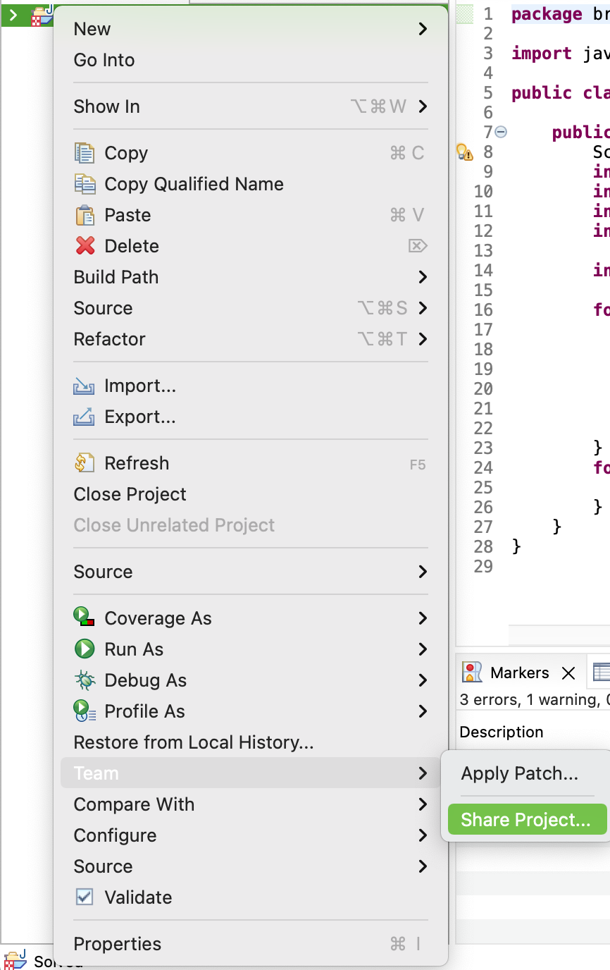 연동할 프로젝트를 우클릭하고 Team - share project 를 선택한다.