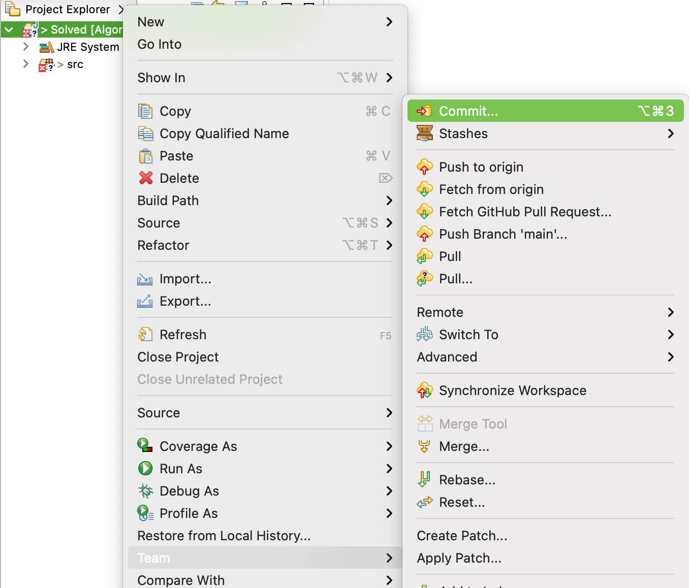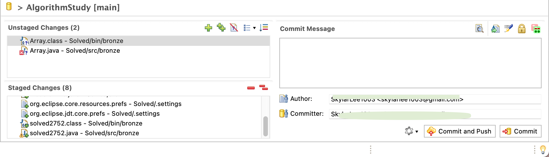 Team - Commit 을 누르면, 오른쪽과 같은 창이 뜬다. 올리고 싶은 파일을 Unstaged Changes에서 Staged Changes로 옮겨준다. +버튼은 하나씩, ++ 버튼은 전부 Staged Changes에 추가하는 것이다.
