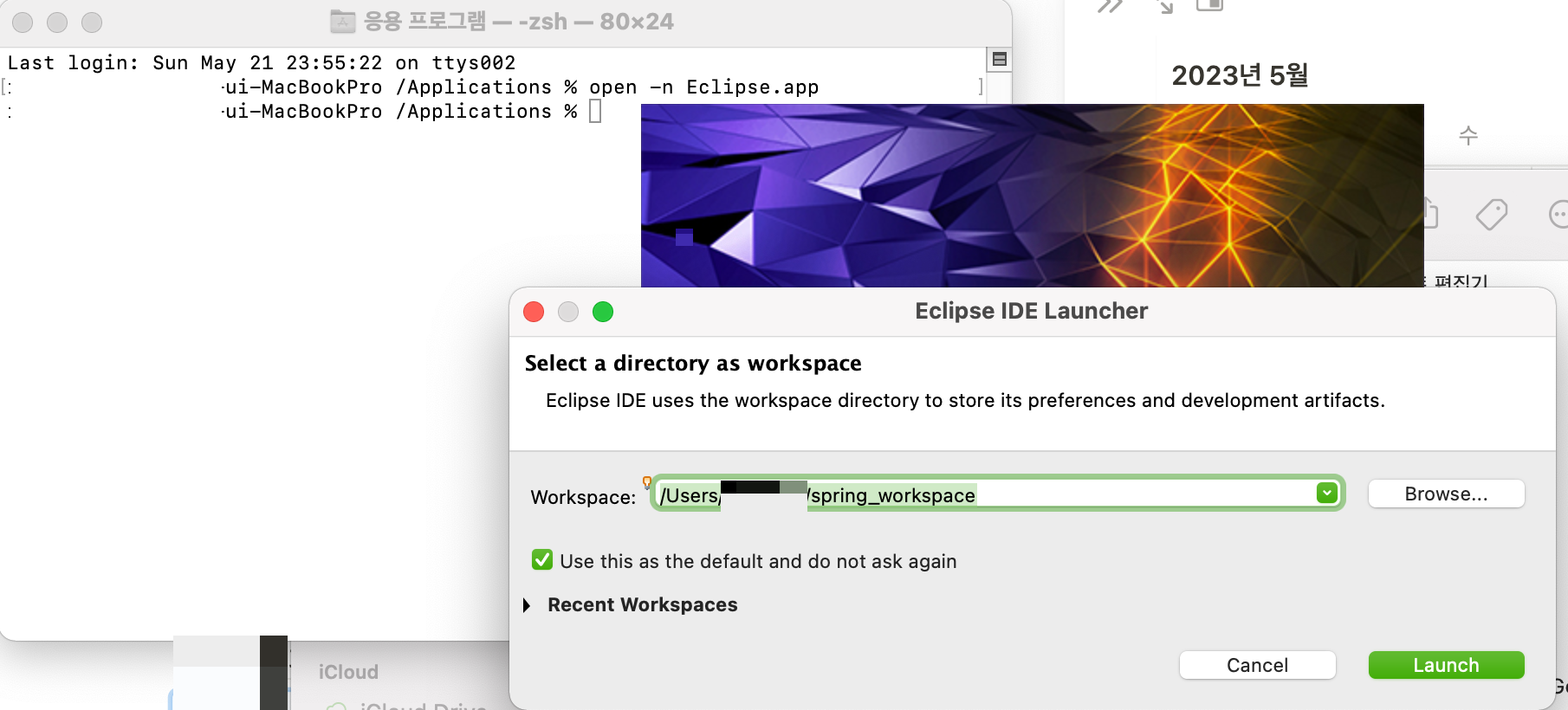아래 코드를 터미널에 입력해 이클립스를 실행한다. 이때 동일한 워크스페이스가 이미 사용중이라고 나오는데, Retry / Choose 중에 Choose를 선택해주면 된다. 그리고 열고 싶은 워크스페이스를 선택하여 Launch 를 누르기. 그럼 끝난다.