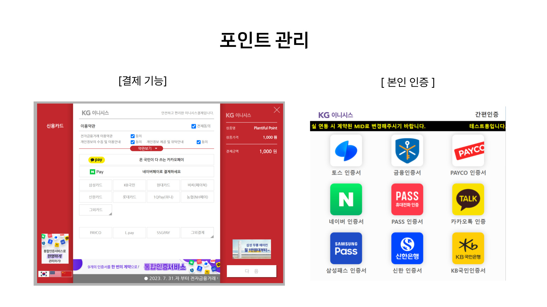 포인트 관리에서는 포인트를 결제하고, 환불에는 본인인증이 필요하도록 기능을 구현하였다.