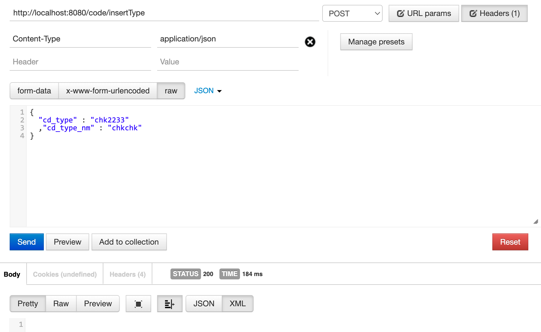 - 데이터 타입을 raw - JSON 으로 변경해준다.