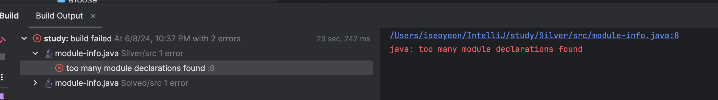 목차 반응형 classpath 가 여러개 선언되어있어서 발생하는 문제이다. 중복 선언된 모듈을 삭제해주면 된다. java: too many module declarations found 반응형 공유하기 게시글 관리 코딩 공부하는 블로그 저작자표시 비영리 변경금지 (새창열림) 목차 목차 닫기