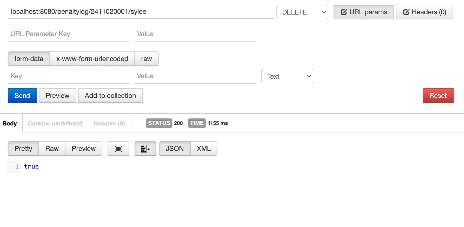 2024-11-08T22:57:48.718+09:00 DEBUG 52870 --- [nio-8080-exec-2] o.s.web.servlet.DispatcherServlet : DELETE "/penaltylog/2411020001/sylee", parameters={}