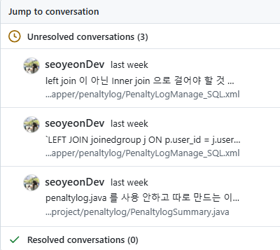 는 해당 PR에 대해 나온 댓글들을 확인할 수 있다.