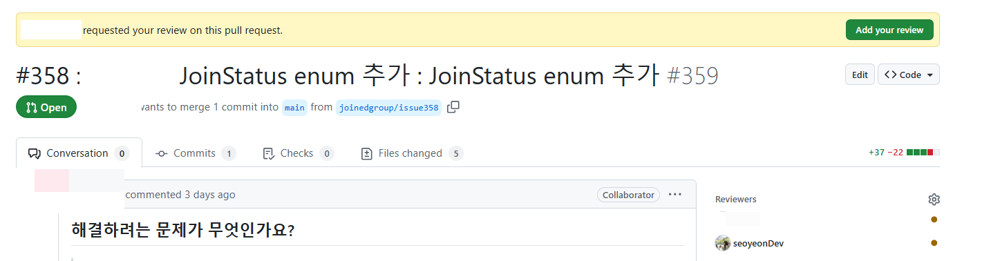 Pull Request(PR) 에 내가 리뷰어로 등록되어 있으면 PR 상세 페이지에 아래와 같이 나타난다.