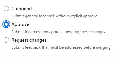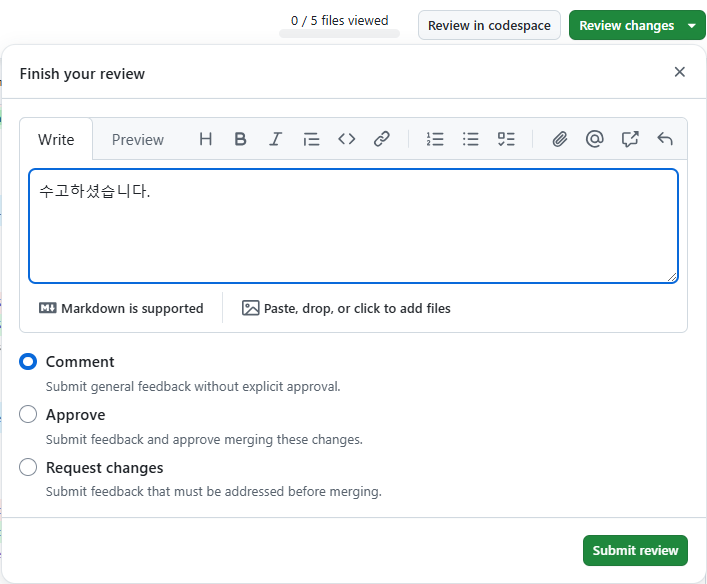 승인을 원할 경우 Approve, 그저 댓글이면 Comment, 코드에 변화를 원하면 Request changes 를 선택하면 된다.