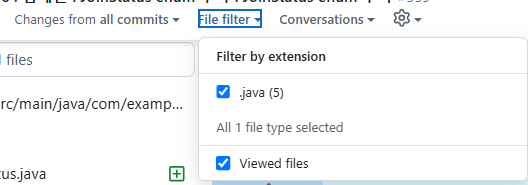 상단 PR 제목 아래의 Changes from all commits, File filter, Conversations 등 Review의 보조 기능이 존재한다.