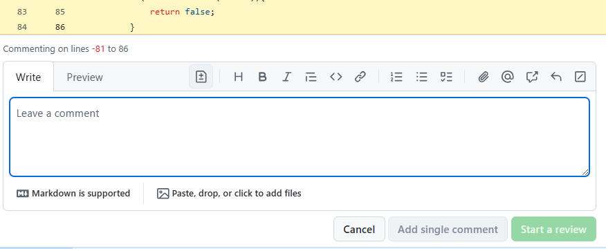 해당 코드에 대한 코멘트를 작성하려면 내용 입력 후, "Strat a Review" 를 선택하면 된다. 그러면 여러 개의 코멘트를 작성할 수 있다.