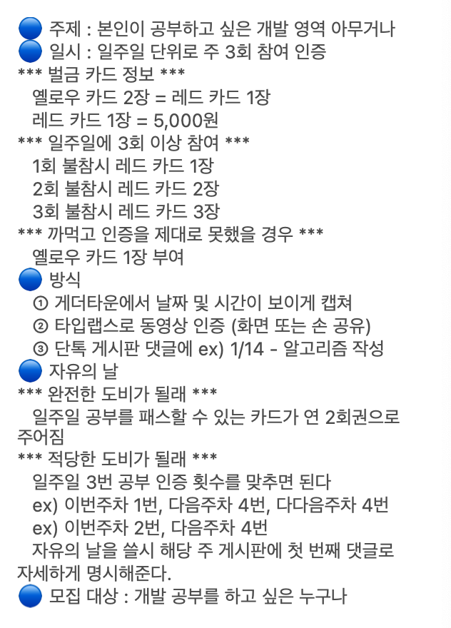 책상에 앉아있는 절대적인 시간이 적다고 느꼈습니다. 해야할 일도 몰아서 하는 경향이 있어, 이를 줄이고자 1주일에 3번 1시간씩 무조건 공부 인증을 해야하는 스터디를 만들었습니다. 다행히 마음이 맞는 친구들과 함께하여 아직까지 문제없이 진행하고 있습니다. 초반과 달리 규칙은 많이 변경되었지만, 일주일동안 꾸준히 공부하겠다는 마음은 최대한 지키려고 노력하고 있습니다.