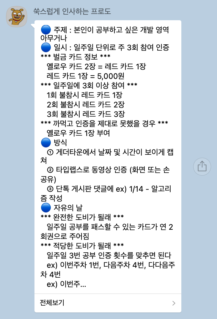 모임은 제가 제안하여 시작했지만, 다같이 운영에 참여해주고 있어 큰 부담은 없이 유지하고 있어 재밌습니다. 저의 2024년 꾸준함에 큰 도움을 준 스터디 입니다.