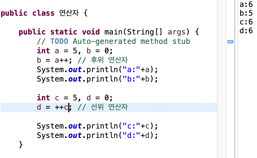 현재 a 값을 b에 할당 후 증가. ++을 나중에 실행하고 5를 b에 할당하고 a를 증가시킨다.