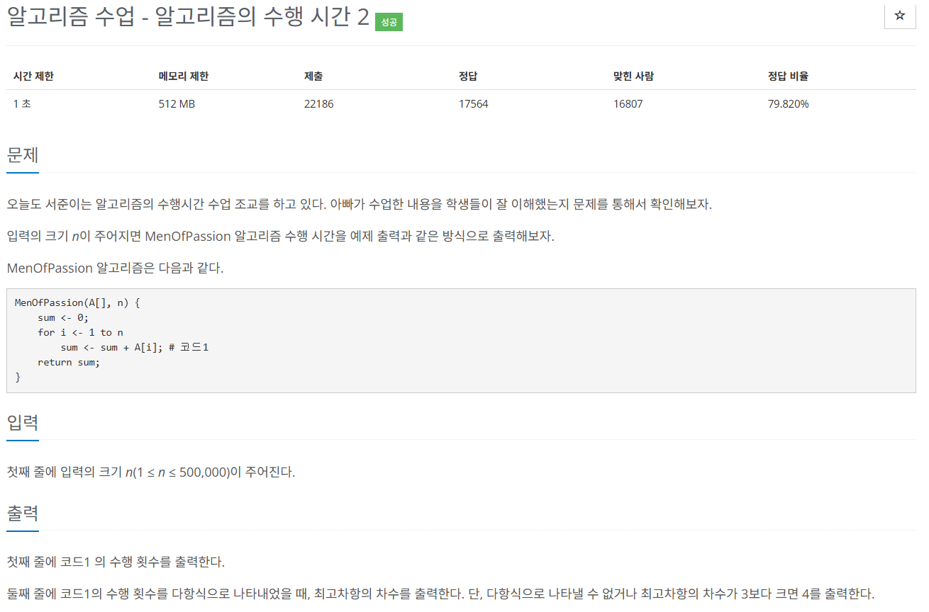 MenOfPassion 함수를 자세히 살펴보면, for 문을 n 회 반복한다는 이야기라는 것을 눈치챌 수 있다. 즉, 시간 복잡도는 O(n) 이다. 다항식으로 표기하면 n, 1차 다항식이므로 최고차항은 1이다.