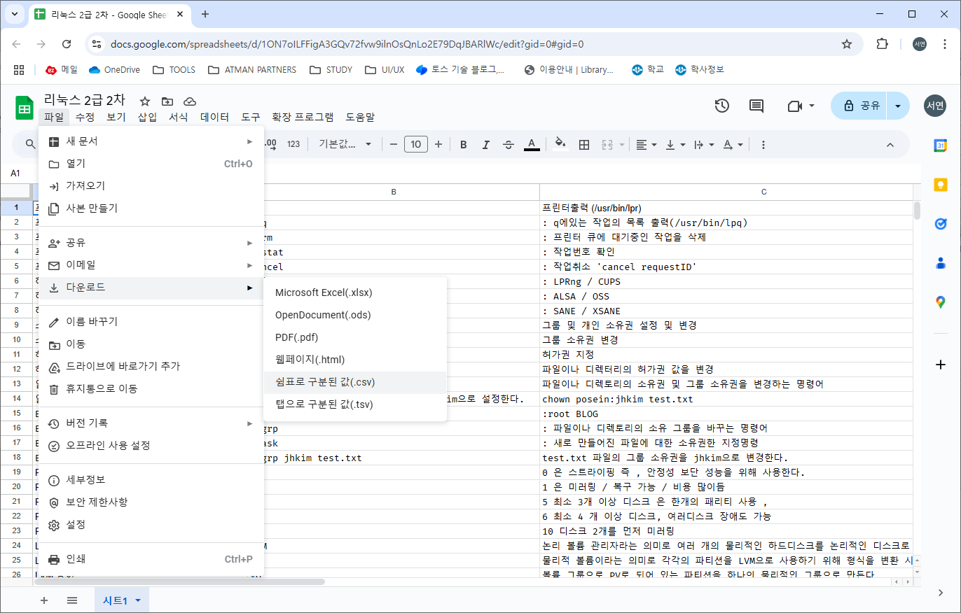 작성을 완료하였으면 파일 > 다운로드 > 쉼표로 구분된 값(.csv) 로 파일을 다운로드 합니다.