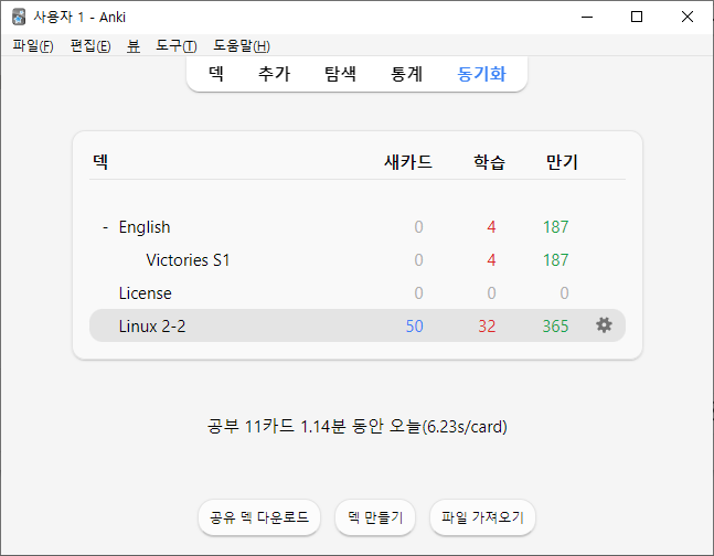 우측 상단의 가져오기를 실행하면, 파일을 가져오고 학습을 진행할 수 있게 됩니다. 다른 플랫폼에서도 사용하기 위해 '동기회' 버튼을 꼭 눌러주세요.