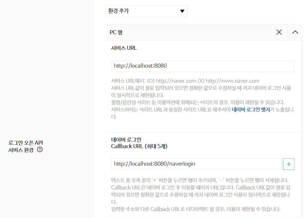 2. 각 항목 내용 채워넣고, 개발용으로 초기 발급일 경우 아래와 같이 localhost 로 URL 작성
