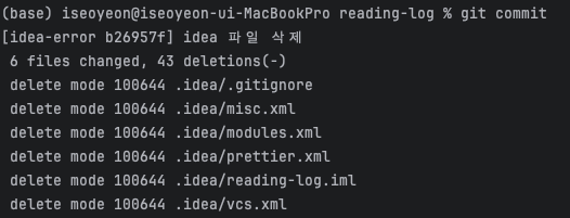 나는 "idea 파일 삭제" 라고 입력해줬다. 정상적으로 커밋되면 아래와 같이 나타난다.