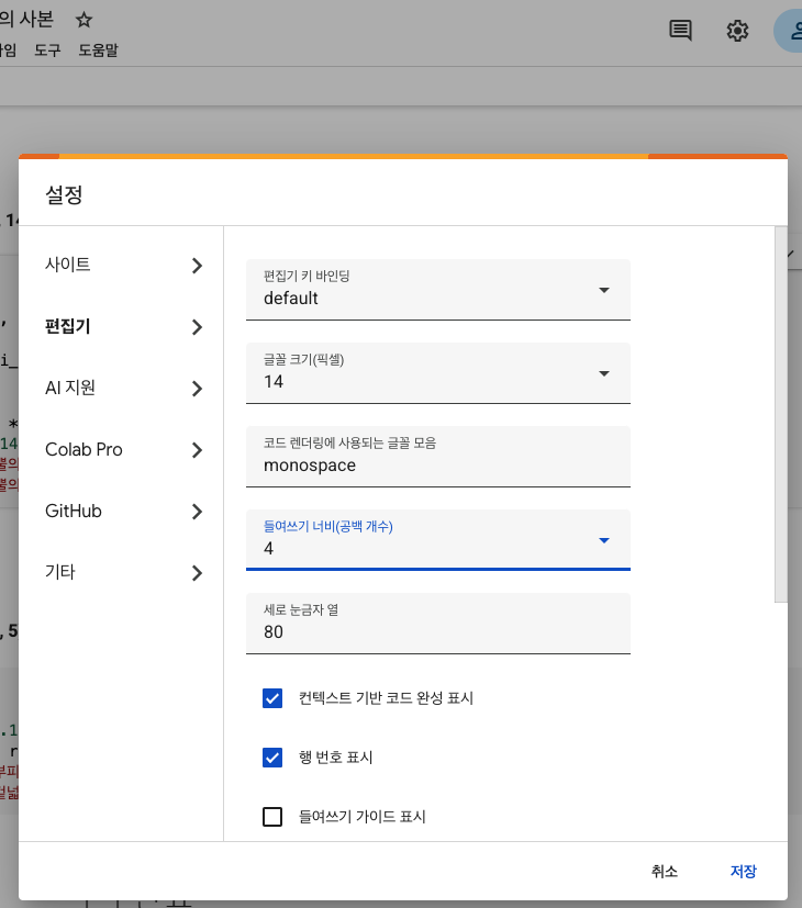 목차 반응형 환경설정 > 편집기 > 들여쓰기 너비 > 4로 변경 위와 같이 변경하면 Tab 시 공백 개수가 4로 변경된다. 반응형 공유하기 게시글 관리 코딩 공부하는 블로그 저작자표시 비영리 변경금지 (새창열림) 목차 목차 닫기