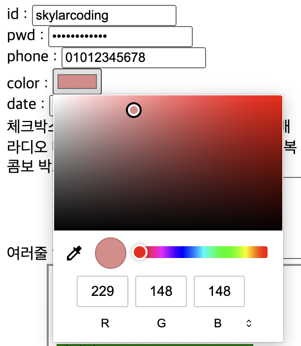 폼 양식 자바 스크립트 (JS) 로 불러내기 폼 양식을 자바 스크립트로 불러오는 문법이다. text, password, number 폼 받기 변수 html 에 위 문법을 사용해 값을 받고 html 변수를 출력하는 코드이다. 폼 양