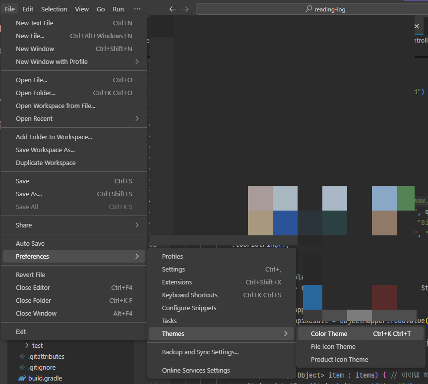 1. File > Preferences > Themes > Color Themes 을 선택하면 상단에 테마 목록이 나타난다.