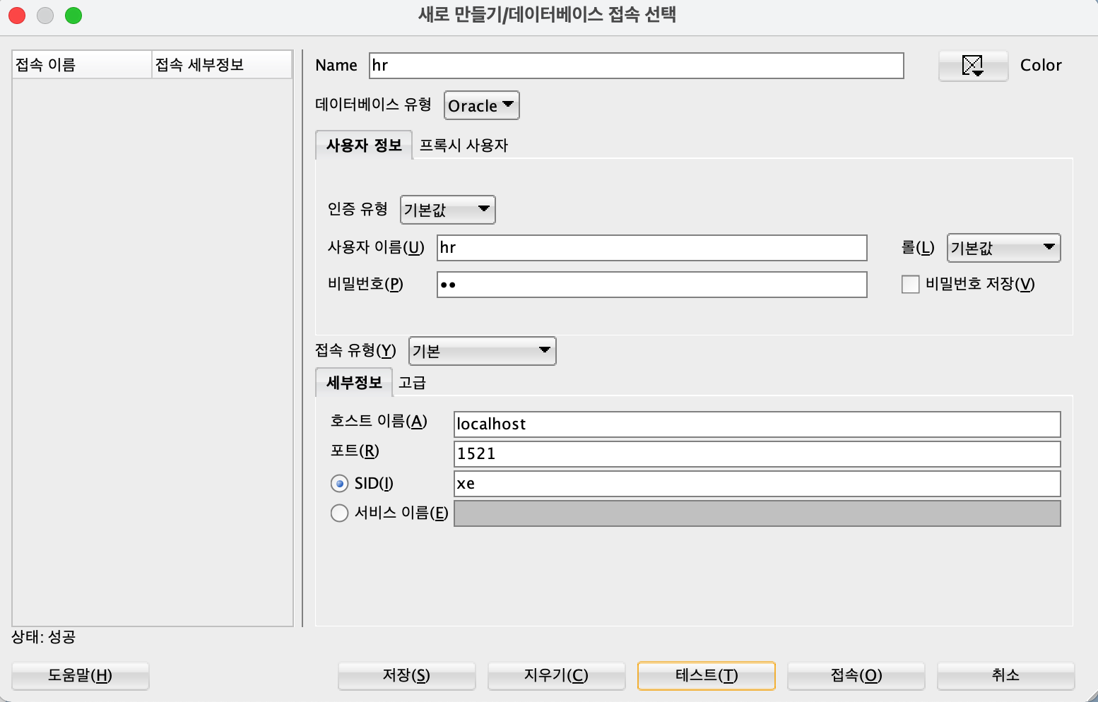 이제 hr 데이터 베이스를 열기 위해서는 왼쪽 접속 밑 초록색 + 버튼을 눌러준다.