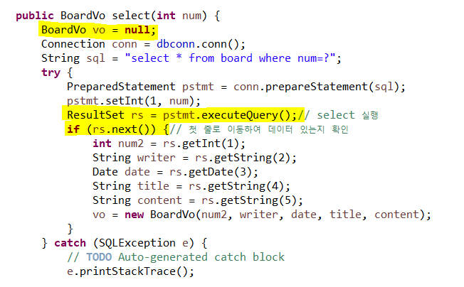 vo = new BoardVo(num2, writer, date, title, content); //조회된 결과를 담기 위해 BoardVo 객체를 생성한다.