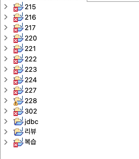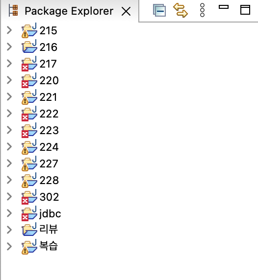 그리고 다른 문제는 이전 포스팅과 위 사진에 보이다시피 프로젝트 파일 옆에 작게 빨간 엑박혹은 빨간 느낌표가 뜨는게 문제였다. 클래스에 문제가 없는 프로젝트까지도.