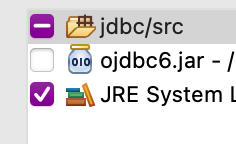에서 왼쪽 사진처럼 JRE System Library 체크 표시를 해준다. 그럼 일단 jdbc 파일에서는 빨간 표시가 사라진다. 다른 파일들에도 해봤는데, 사라지는 것도 있고 아닌 것도 있고.. 일단 돌아가서 굳이 또 건들지는 않았다.