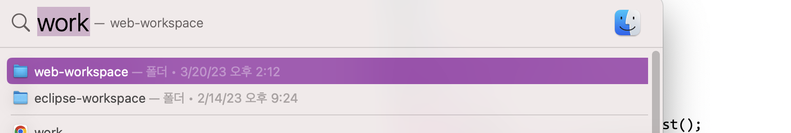 우선 web-workspace 폴더를 찾아야한다. 하지만 파일이 어딘가에 숨어있는 맥북으로서 파인더에서 직접 찾기는 하늘의 별따기. (나만 그럴수도.. 또 내가 무지했을수도...)