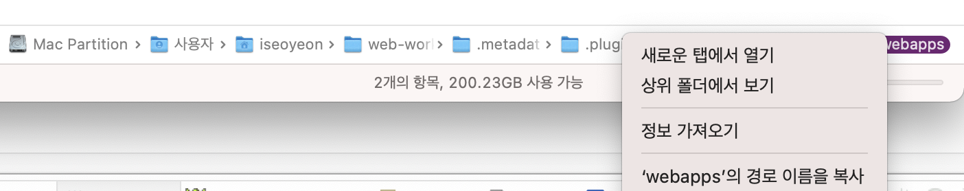 아래와 같이 경로 제일 마지막 우클릭 - 경로 이름을 복사 를 통해 경로를 복사할 수 있다. 참고로 webapps 안에 생성한 폴더 경로까지 복사해줘야한다.